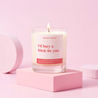 A funny candle gift for bestie, subtly highlighting the intensity of your friendship. The message on the candle reads, 'I'd bury a bitch for you’ in our signature bold red font on a pale pink label.