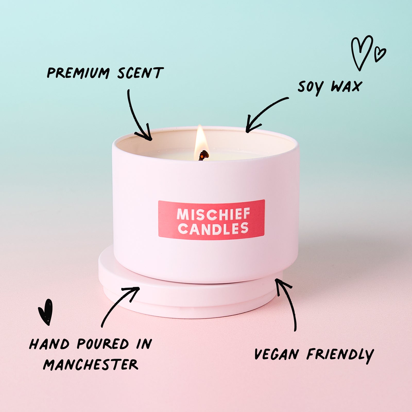 Each Mischief Candles tin is hand poured in Manchester and crafted from 100% natural soy wax for a clean, even burn. Housed in our signature pink tin with bold red design details, every candle is made to stand out on your shelf (and your socials).